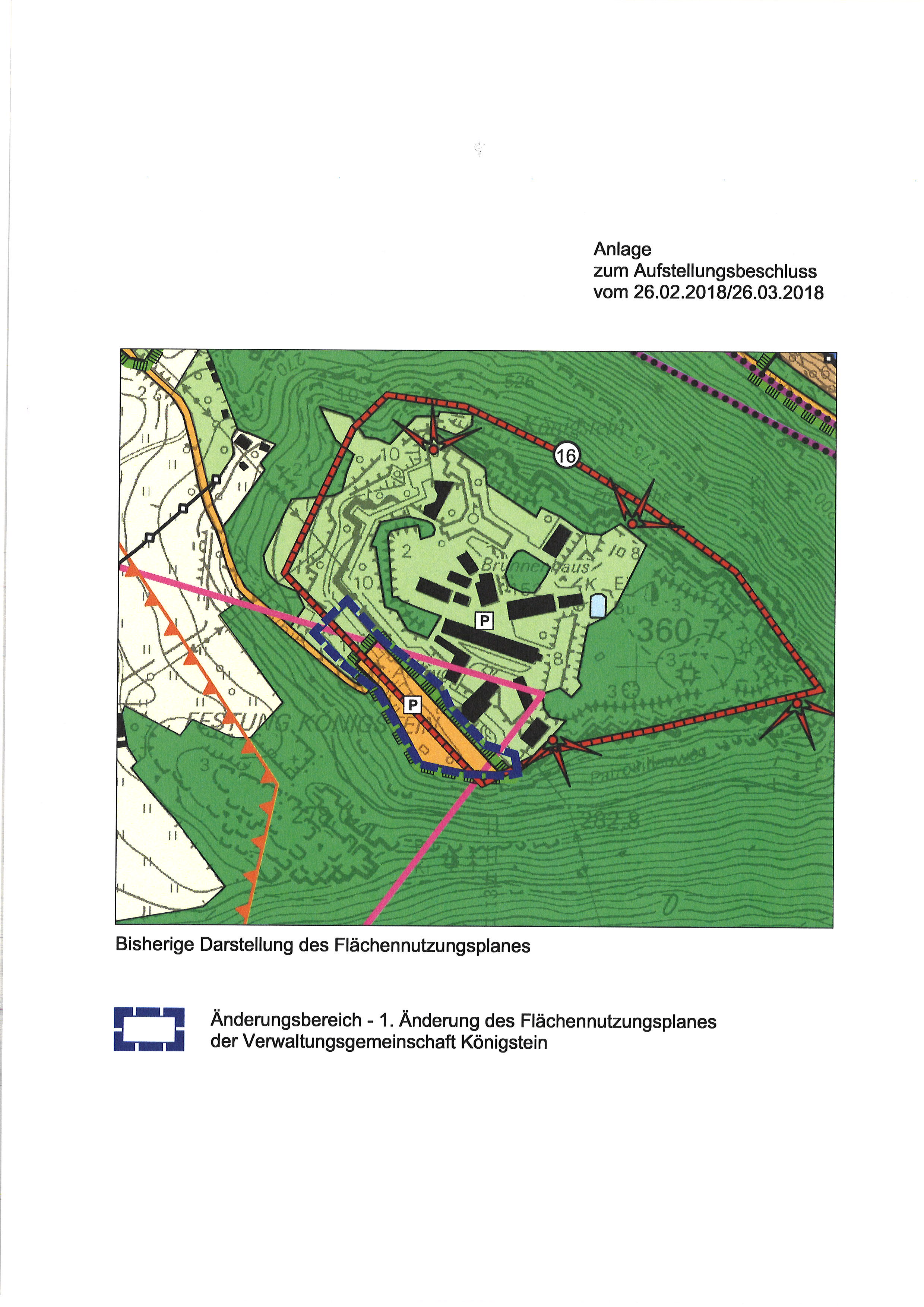 Der Gemeinschaftsausschuss der Verwaltungsgemeinschaft Königstein hat am 26.02.2018 den Aufstellungsbeschluss für die 1. Änderung des Flächennutzungsplanes der Verwaltungsgemeinschaft Königstein gefasst, die parallel zum Aufstellungsverfahren des Bebauungsplanes „Vorplatz Festung Königstein“ durchgeführt werden soll. ...